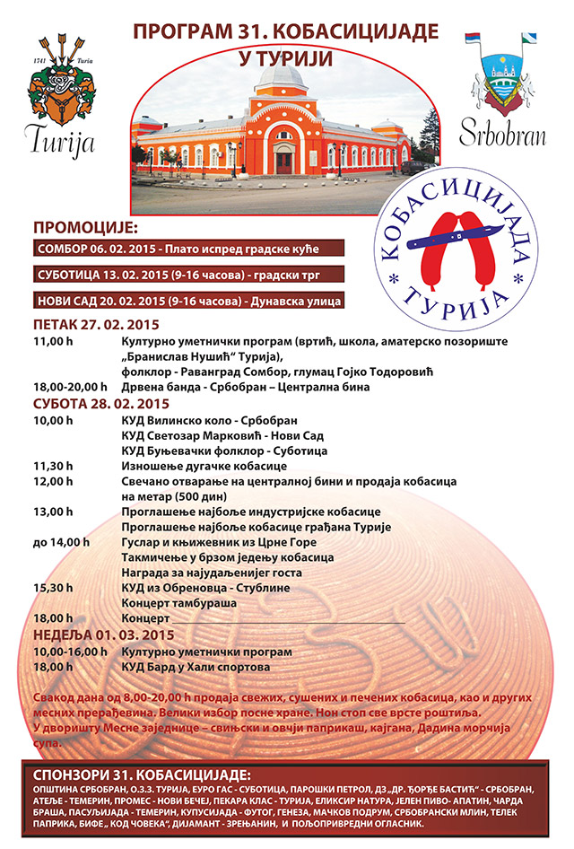 Posetioce u Turiji, između ostalog, očekuje i takmičenje u brzom jedenju kobasica, kao i nastupi brojnih kulturno-umetničkih društava. Program će u Turiji trajati od 11 časova do kasnih večernjih sati.